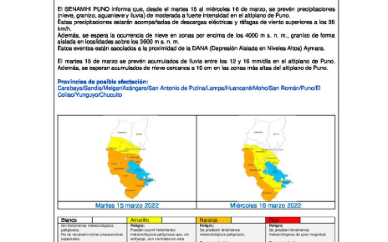 El SENAMHI PUNO informa que, desde el martes 15 al miércoles 16 de marzo, se prevén precipitaciones (nieve, granizo, aguanieve y lluvia) de moderada a fuerte intensidad en el altiplano de Puno.