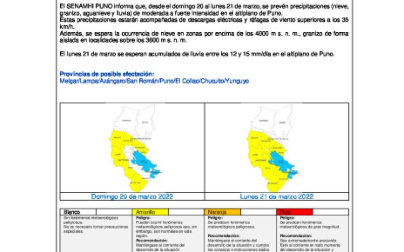 PRECIPITACIONES EN EL ALTIPLANO DE PUNO Inicio del evento: Domingo 20 de marzo de 2022 a las 00:00 horas Fecha de emisión: Jueves 17 de marzo de 2022 Fin del evento: Lunes 21 de marzo de 2022 a las 23:59 horas