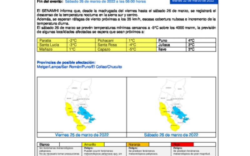 Aviso Meteorológico N°066 "Descenso de la temperatura nocturna en la sierra sur y centro" regionalizado por parte de la Dirección Zonal 13