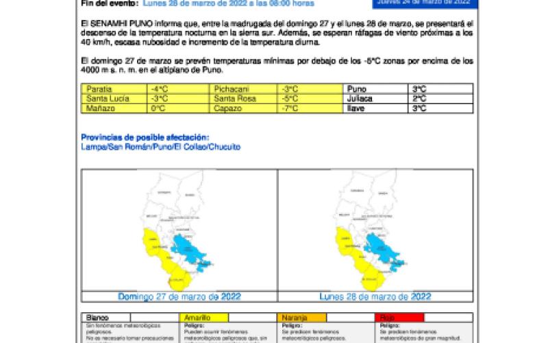 Aviso Meteorológico N°070 "Descenso de la temperatura nocturna en la sierra sur" regionalizado por parte de la Dirección Zonal 13