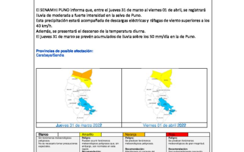 AVISO METEOROLOGICO N° 075 DE LLUVIAS EN LA SELVA DE PUNO, PARA EL 31 DE MARZO Y 01 DE ABRIL 2022.
