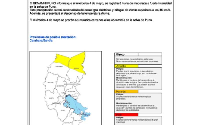 El SENAMHI PUNO informa que el miércoles 4 de mayo, se registrará lluvia de moderada a fuerte intensidad en la selva de Puno.
