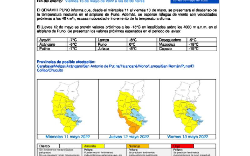 AVISO METEOROLOGICO N° 094 DE DESCENSO DE TEMPERATURA NOCTURNA EN EL ALTIPLANO DE PUNO, PARA LOS DIAS 11,12 Y 13 DE MAYO DEL 2022
