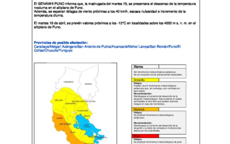 Aviso Meteorológico N°085 "Descenso de la temperatura nocturna en el Altiplano de Puno" para el 19 de abril del 2022.