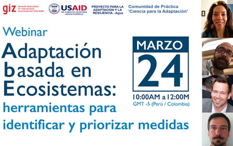 Mié, 01/03/2017 - 12:00 Seminario virtual: “Adaptación basada en Ecosistemas: herramienta para identificar y priorizar medidas” Autor Deutsche Gesellschaft für Internationale Zusammenarbeit (GIZ) US Agency for International Development (USAID) COMPATIR Metadatos Mostrar el registro completo del ítem