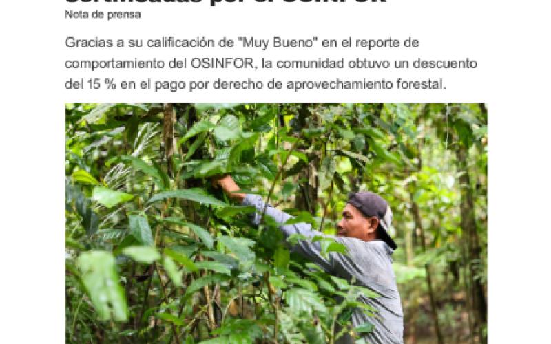 Gracias a su calificación de "Muy Bueno" en el reporte de comportamiento del OSINFOR, la comunidad obtuvo un descuento del 15 % en el pago por derecho de aprovechamiento forestal.