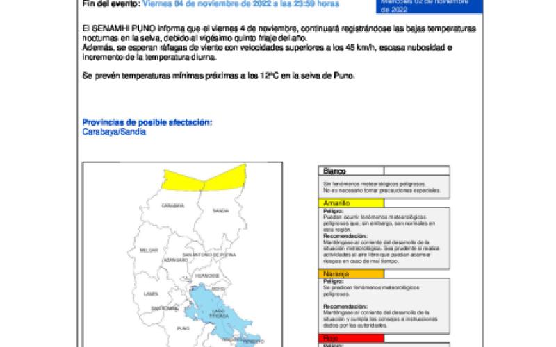 El SENAMHI PUNO informa que el viernes 4 de noviembre, continuará registrándose las bajas temperaturas nocturnas en la selva, debido al vigésimo quinto friaje del año.