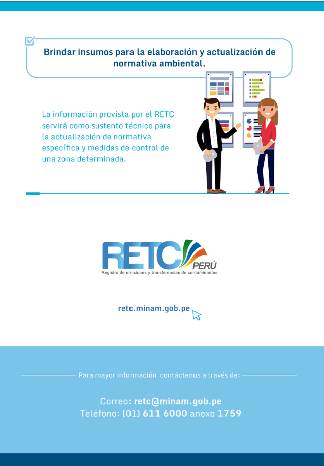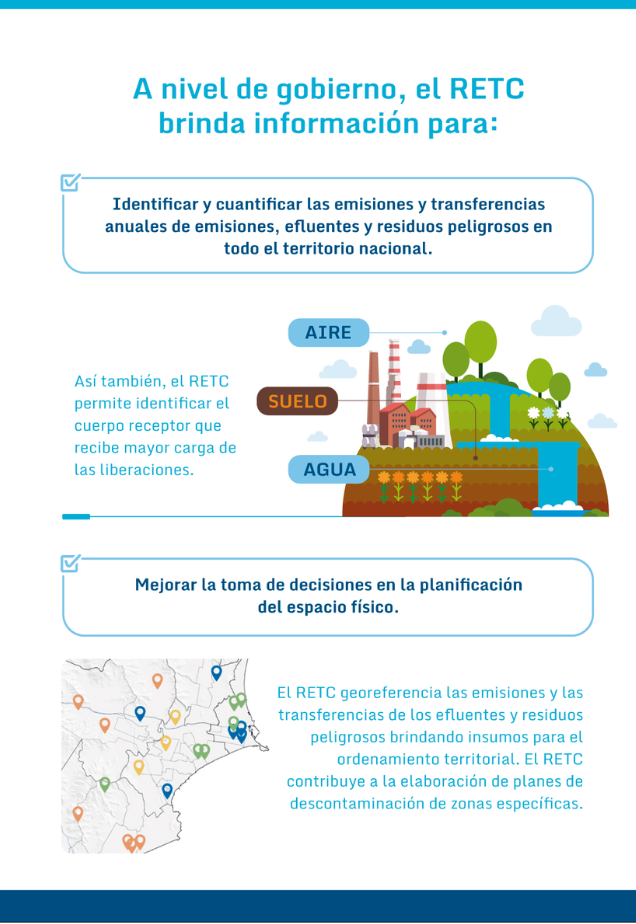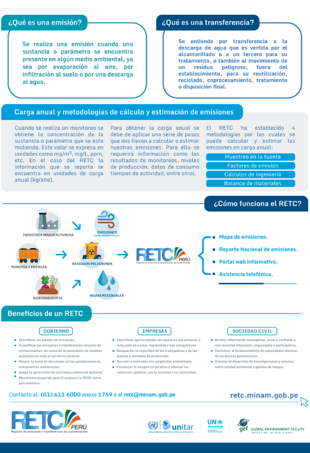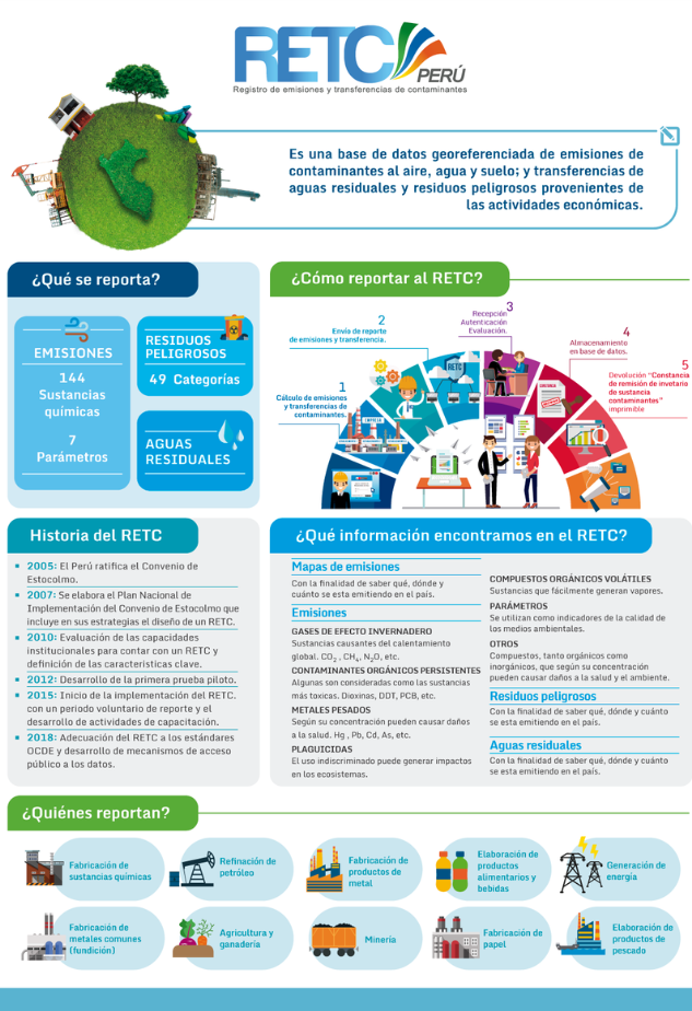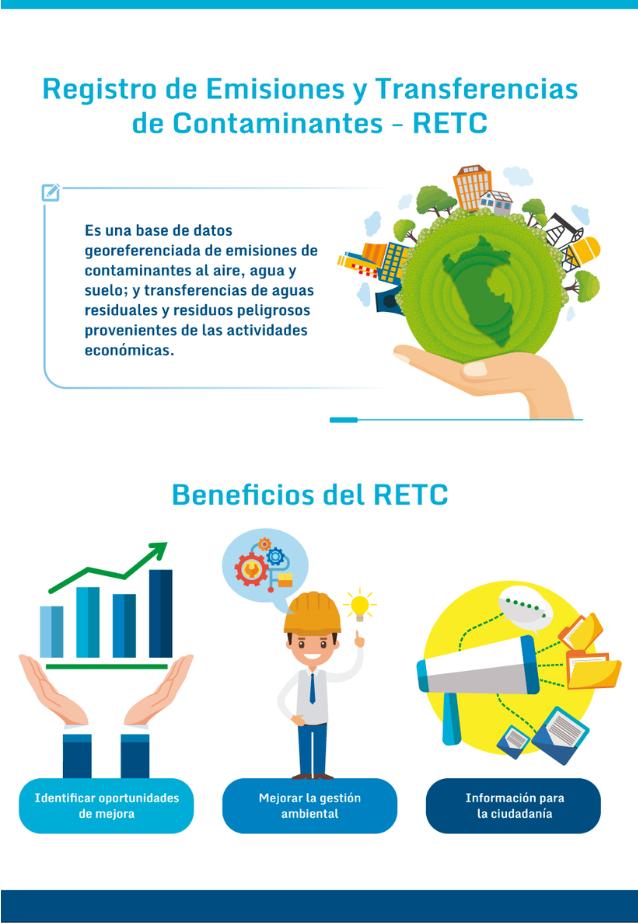 El Registro de Emisiones y Transferencias de Contaminantes – RETC, es un mecanismo de gestión de información ambiental articulado al Sistema Nacional de Información Ambiental – SINIA, consistente en un inventario o base de datos de los materiales y sustancias químicas potencialmente dañinas a la salud humana, que son emitidas al ambiente y/o transferidas fuera del lugar de generación para su tratamiento o disposición final.